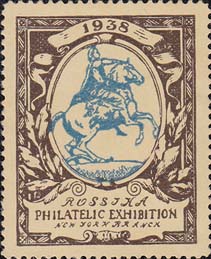 1938 г. Разм. рамки 31 х 39 мм. Двухцветная печать на простой светло-желтой бумаге. Зубц. 11 3/4. С клеем. В центре в декоративной прямоугольной рамке в центре в овале портрет памятник Петру I. Сверху на ленте дата. Внизу текст в три строки на английском языке.