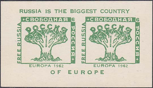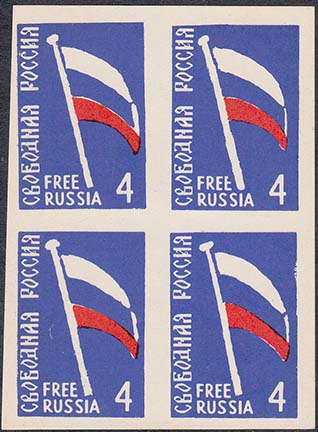 1961 г. 02.08.1961 г. Блок разм. 129 х 85 мм. Двухцветная печать на белой бумаге. С клеем. В центре три марки с портретом генерала Власова и эмблемой РОА. тексты на русском и английском языках.