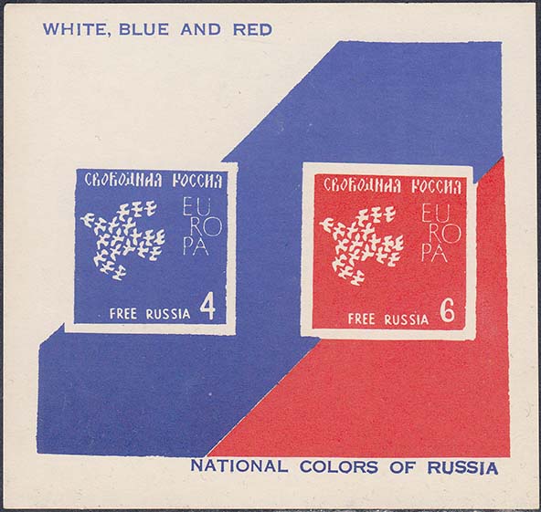 1961 г. 01.10.1961 г. Блок разм. 100 х 94 мм. Двухцветная печать на белой бумаге. В центре на фоне цветов российского флага две марки с символами объединенной Европы. Тексты на русском и английском языках.