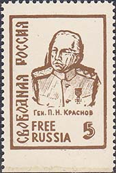 1962 г. 17.01.1962 г. Разм. рамки 24 х 32 мм. Одноцветная печать на белой бумаге. Зубц. 11 3/4 и БЗ. С клеем. В центре портрет генерала Краснова, номинал и тексты на русском и английском языках.