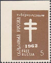 1962 г. 01.09.1962 г. Разм. рис. 24 х 32 мм. Одноцветная печать на белой бумаге. Зубц. 11 3/4 и Б.З. С клеем. В центре на сплошном фоне Лотарингский крест и дата: "1962". По периметру номинал и тексты на русском и английском языках.
