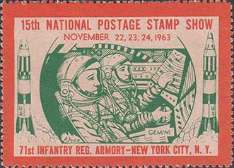 1963 г. Разм. рис. 49 х 34 мм. Двухцветная печать на белой бумаге. Зубц. 12 1/2. С клеем. В центре астронавты в кабине космического корабля. По бокам ракета. Тексты на английском языке.