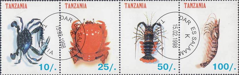 1998 г. Разм. по перфорации 35 Х 44 мм. В центре ракообразные различных видов, название страны на английском языке и номинал.