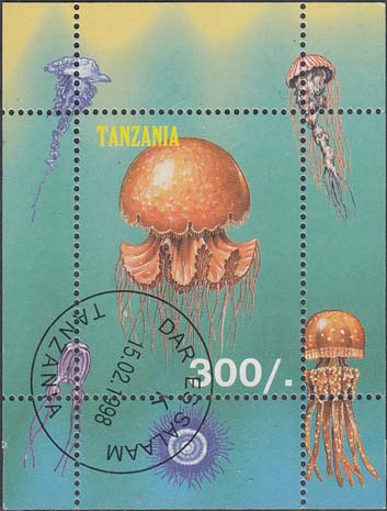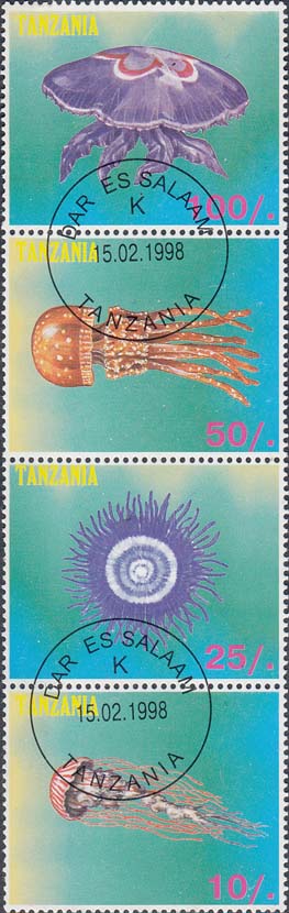 1998 г. Разм. по перфорации 45 х 36 мм. В центре медузы различных видов, название страны на английском языке и номинал.