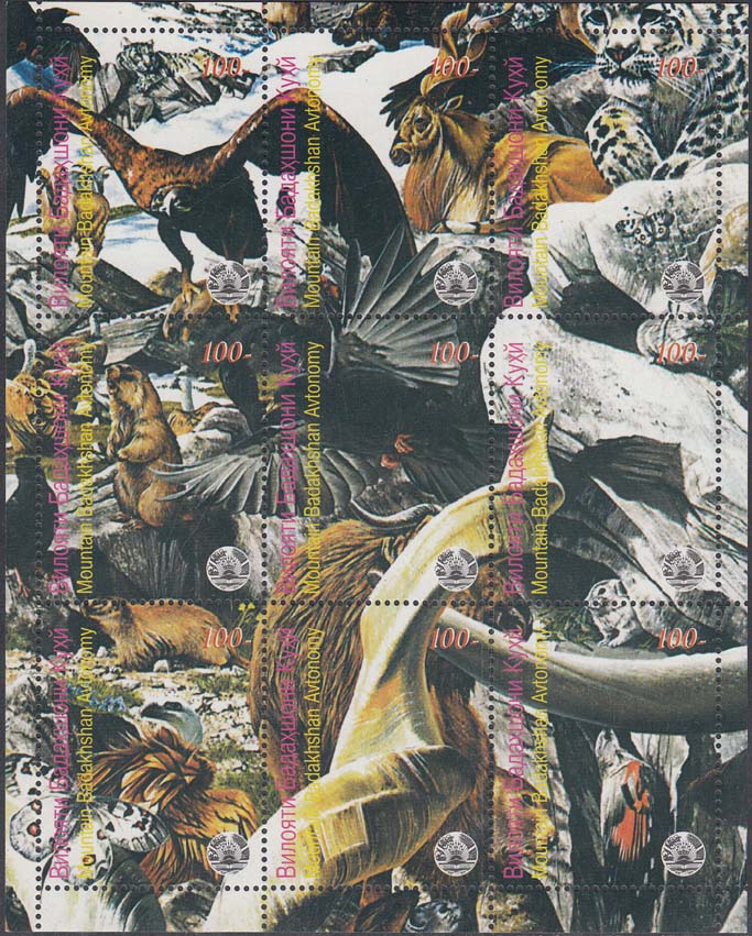 1996(?) г. Разм. по перфорации 35 х 44 мм. Многоцветная печать на белой глянцевой бумаге. Зубц. 13 3/4. С клеем. В центре фрагменты изображений различных животных и птиц. По периметру номинал, название региона на таджикском и английском языках, и герб.