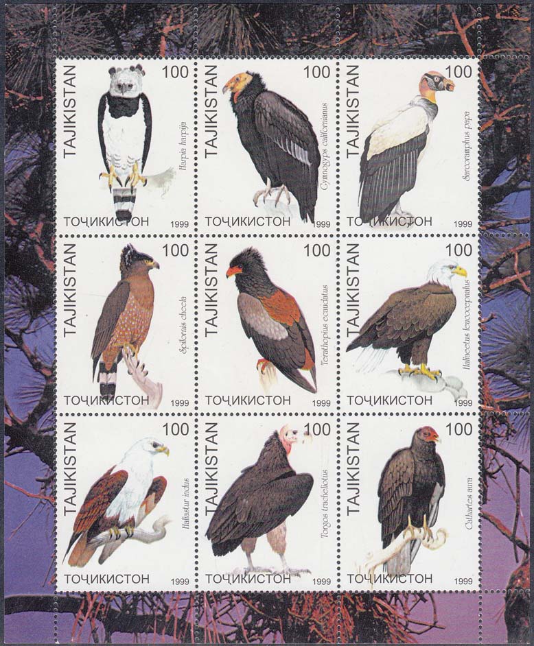 1999 г. Разм. по перфорации 34 х 44 мм. Многоцветная печать на белой глянцевой бумаге. Зубц. 13 3/4. С клеем. В центре изображение птиц различных видов. По периметру название страны на русском и таджикском языках, пояснительная подпись и номинал.
