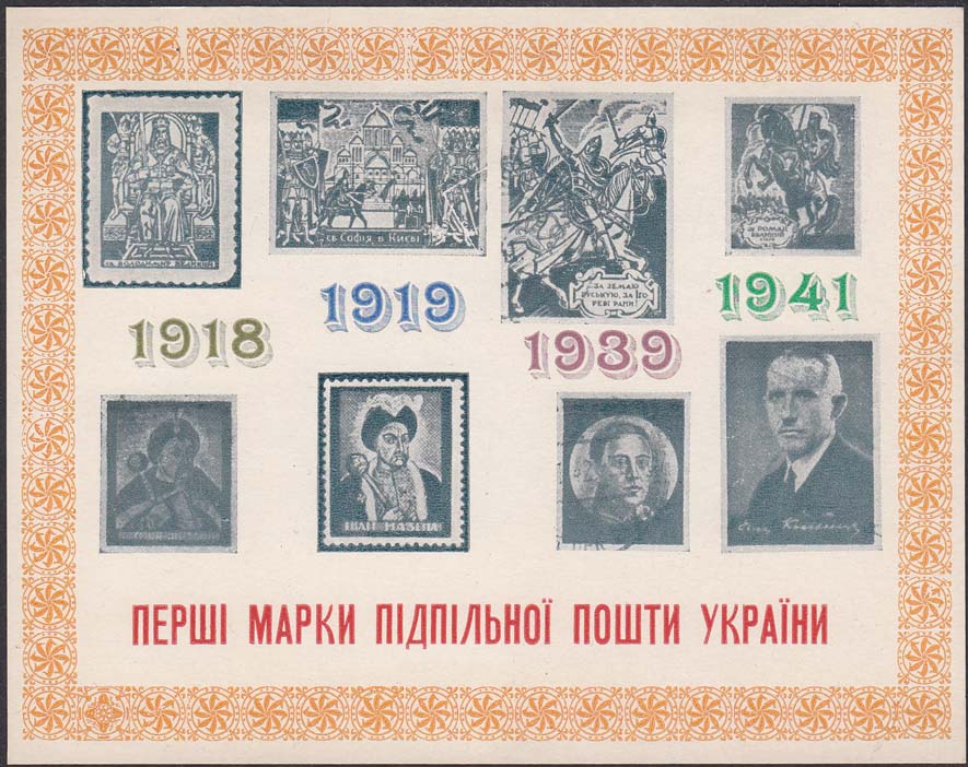1961 г. К 40-летию 1-го Пражского выпуска ОУН. Листок разм. 151 х 118 мм. Многоцветная печать на толстой белой глянцевой бумаге. В прямоугольной декоративной рамке разм. 144 х 110 мм изображения марок первого выпуска ОУН, изданного в 1941 г. В Праге. В центре между марками даты: "1918 1919 1939 1941". Внизу текст на украинском языке: "Первые марки Подпольной Почты Украины"