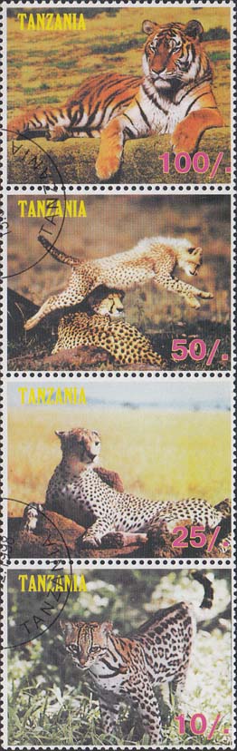 1998 г. Разм. по перфорации 45 х 36 мм. В центре тигры, название страны на английском языке и номинал.