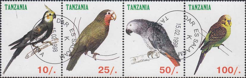 1998 г. Разм. по перфорации 35 х 44 мм. В центре попугаи различных видов, название страны на английском языке и номинал.