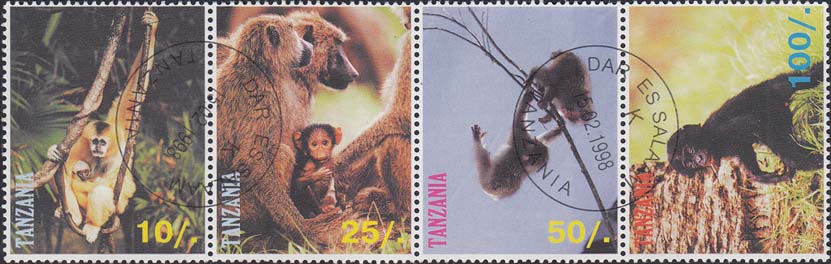 1998 г. Разм. по перфорации 45 х 36 мм. В центре обезьяны различных видов, название страны на английском языке и номинал.