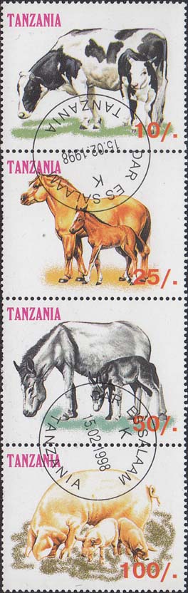 1998 г. Разм. по перфорации 45 х 36 мм. В центре домашние животные различных видов, название страны на английском языке и номинал.
