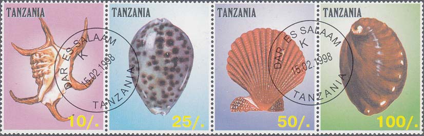 1998 г. Разм. по перфорации 45 х 36 мм. В центре раковины различных видов, название страны на английском языке и номинал.