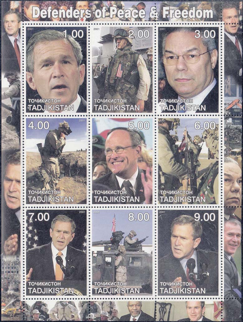 2001 г. Разм. рис. 33 х 47 мм. Многоцветная печать на белой глянцевой бумаге. Зубц. 13 1/2. С клеем. В центре репродукции фотографий американских политиков и военных. Сверху дата: "2001" номинал. Внизу название страны на кирилице и латинице.