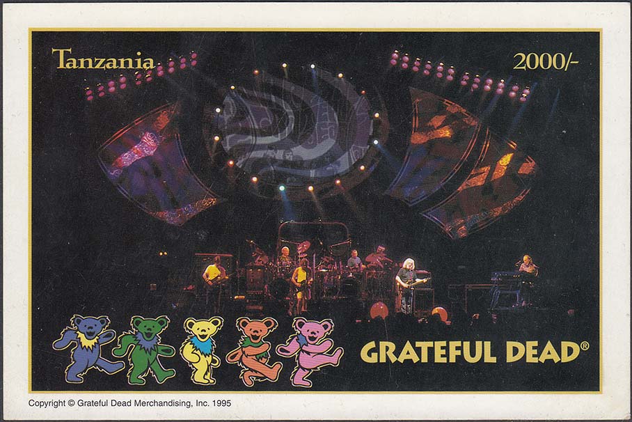 1995 г. 1995 г. Листок разм. 153 х 102 мм. Многоцветная двухсторонняя печать на толстой глянцевой белой бумаге. На лицевой стороне в центре на сплошном фоне группа "Grateful dead" на сцене. Название страны, номинал и тексты на английском языке. На оборотной стороне в центре крупно номер нумератором.