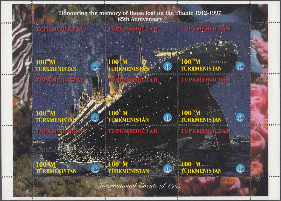 1997 г. Разм. по перфорации 51 х 36 мм. Многоцветная печать на белой мелованной бумаге. Зубц. 13 1/2. В центре различные фрагменты изображения тонущего Титаника. По периметру название страны на русском и английском языках и номинал.