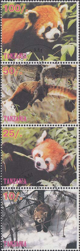 1998 г. Разм. по перфорации 45 х 36 мм. В центре красная панда, название страны на английском языке и номинал.