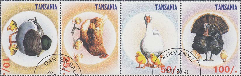 1998 г. Разм. по перфорации 45 х 36 мм. В центре домашние птицы, название страны на английском языке и номинал.