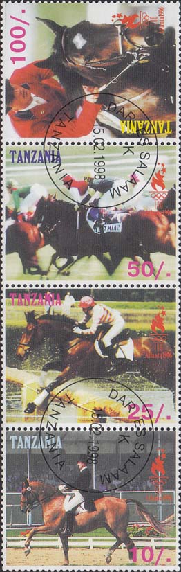1998 г. Разм. по перфорации 45 х 36 мм. В центре конно-спортивные соревнования, название страны на английском языке и номинал.