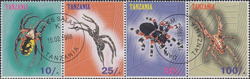 1998 г. Разм. по перфорации 45 х 36 мм. В центре пауки различных видов, название страны на английском языке и номинал.