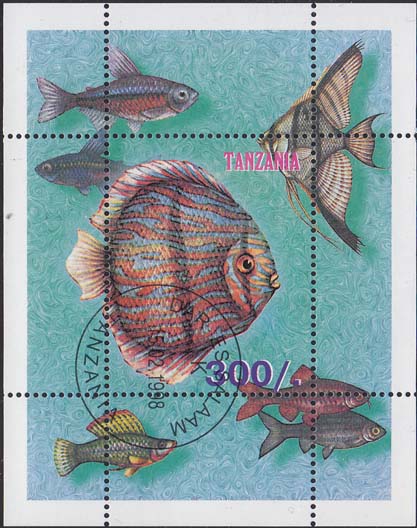 1998 г. Блок разм. 70 х 89 мм. Многоцветная печать на белой глянцевой бумаге. Зубц. 13 3/4. Разм. рис. 62 х 80 мм. В центре на марке и на полях рыбы различных видов. В правом верхнем углу название страны на английском языке. В правом нижнем углу номинал.
