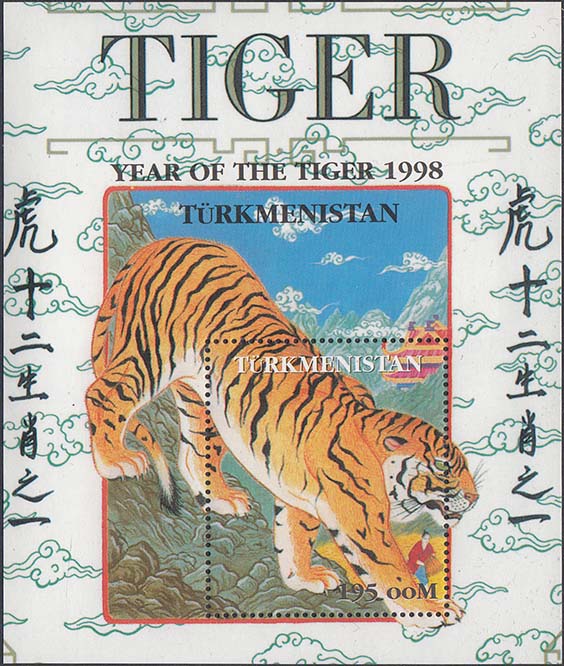 1989 г. Блок разм. 95 х 112 мм. Зубц. 13 1/2. С клеем. В центре тигр на фоне джунглей. На полях текст: "Год тигра 1998".