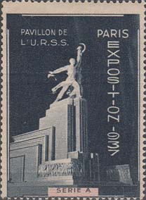 1937 г. Разм. рамки 32 х 45 мм. Одноцветная печать на белой бумаге. Зубц. 13 1/2. С клеем. В центре на сплошном фоне павильон СССР на выставке в Париже 1937 г. Текст на французском языке: "Павильон СССР. Париж. выставка 1937. Серия А".