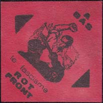 1939(?) г. Ромб разм. 48 х 48 мм. Одноцветная печать на плотной розовой бумаге. На лицевой стороне в центре рабочий замахивается на штурмовика. Текст на французском языке: "Долой фашизм. Rot front". На оборотной стороне карикатура на А. Гитлера и различные лозунги на французском языке.