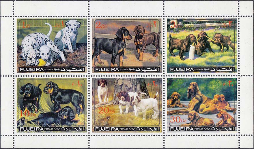 2000 г. Разм. рис. 84 х 99. Многоцветная печать на плотной белой глянцевой бумаге. Зубц. 13 1/2 низкого качества. В центре и на полях собаки. В левом верхнем углу номинал. Внизу и на полях название страны на английском и арабском языках.