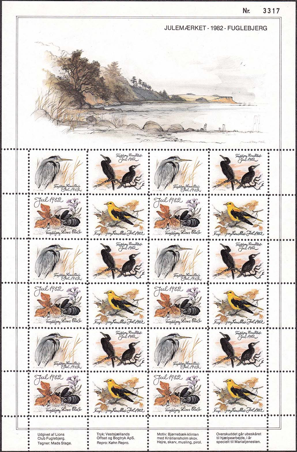 1982 г. Разм. 35 х 26 мм. Многоцветная печать на белой бумаге. Зубц. 10 1/2. С клеем. В центре птицы различных видов.