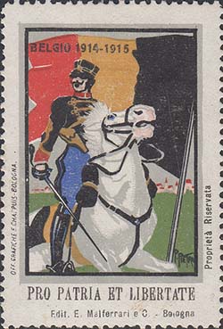 1915 г. Разм. рамки 36 х 50 мм. Многоцветная печать на белой бумаге. Зубц. 10. С клеем. В прямо-угольной рамке в центре различные рисунки. Внизу текст на итальянском языке: «За Родину и свободу». Внизу выходные данные на итальянском языке мелким шрифтом.