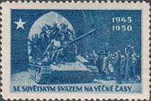 1950 г. Разм. рис. 32 х 21 мм. Одноцветная печать на белой бумаге. Зубц. 12 1/4. С клеем. В центре на сплошном фоне различные рисунки и тексты на чешском языке.