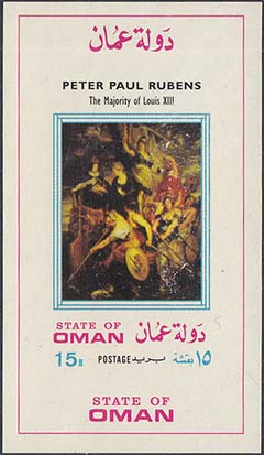 1980 г.  Живопись Рубенса. Разм. 40 х 70 мм. Многоцветная печать на белой глянцевой бумаге. С клеем. В центре в прямоугольной рамке разм. 34 х 64 мм репродукция картины.