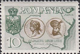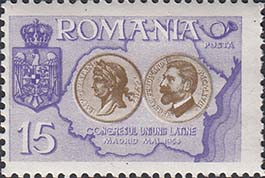 1954 г. 10.05.1954 г.  Разм. рис. 39 х 25 мм. Многоцветная печать на белой бумаге. Зубц. 10 1/2 и Б.З. С клеем. В центре карта Румынии и портреты исторических персонажей, герб и номинал.