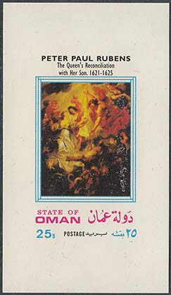 1980 г. Разм. 40 х 70 мм. Многоцветная печать на белой глянцевой бумаге. С клеем. В центре в двойной прямоугольной рамке картины Рубенса. Тексты на английском и арабском языке и номинал.