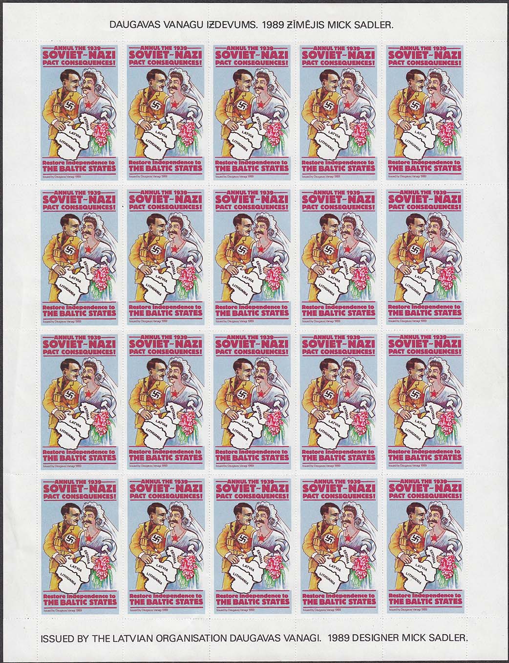 1989 г.   Разм. рис. 27 х 47 мм. Многоцветная печать на белой мелованной бумаге. Нерегулярная мелкая просечка. С клеем. В центре на сплошном фоне аллегорический рисунок: Сталин и Гитлер в виде свадебной пары. Сверху текст в четыре строки на английском языке: «Ликвидировать последствия советско-нацистского пакта 1939». Внизу текст в две строки на английском языке: «Восстановить независимость Балтийских стран». Внизу мелким шрифтом выходные данные на английском языке: «Издание daudavas vanagi».
