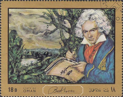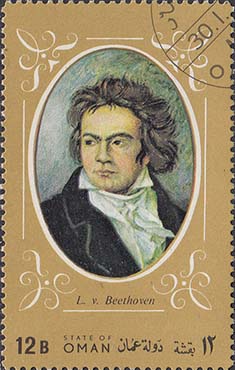 1972(?) г.   Разм. по перфорации 39 х 63 и 80 х 63 мм. Многоцветная печать на белой бумаге. Зубц. 11 1/4. В центре различные портреты Бетховена. Тексты на английском и на арабском языке.