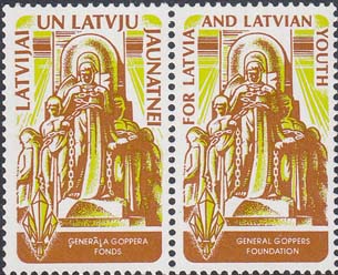 1989 г.   Разм. рис. 22 х 38 мм. Многоцветная печать на белой глянцевой бумаге. Зубц. 12 1/2. С клеем. В центре скульптурная композиция. Сверху полукругом текст на английском и латышском языке: "Для Латвии и латвийской молодежи". Внизу эмблема и название организации на латышском или английском языке.