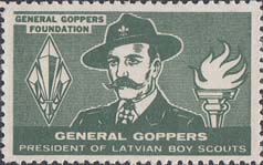 1962 г. Разм. 36 х 22 мм. Одноцветная печать на белой бумаге. Зубц. 12 1/2. С клеем. В прямоугольной рамке на сплошном фоне в центре портрет К.Гоппера. Слева эмблема организации. Справа факел и название организации.