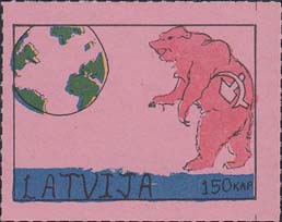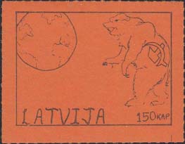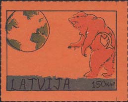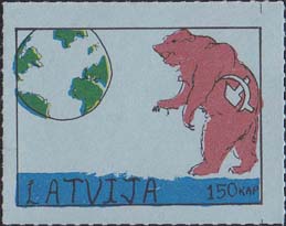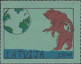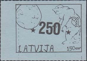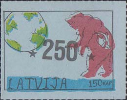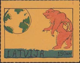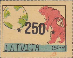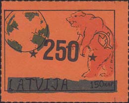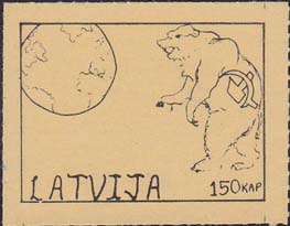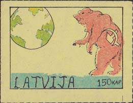 1980(?) г.   Разм. по перфорации ≈ 45 х 34 мм. Одноцветная и многоцветная печать на бумаге различных цветов. Линейная просечка. С клеем. В прямоугольной рамке разм. 37 х 27 мм примитивный рисунок. Земной шар и медведь с серпом и молотом. Внизу текст на английском языке: "Латвия" и номинал.