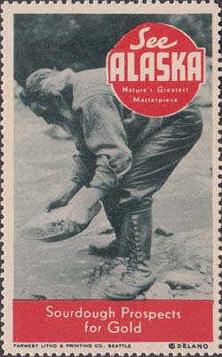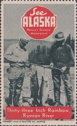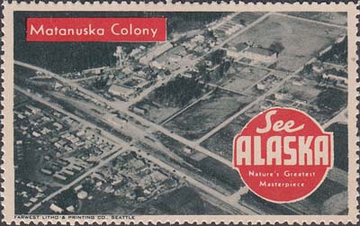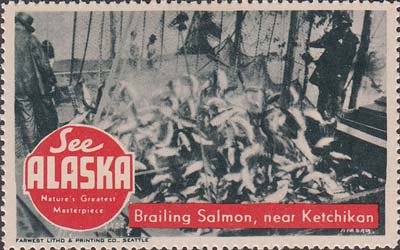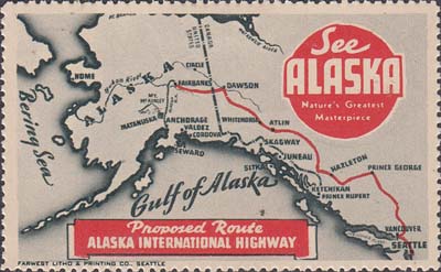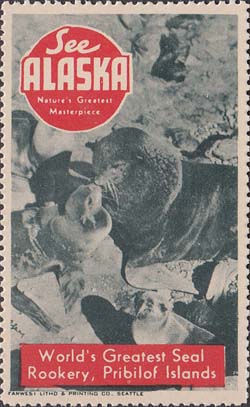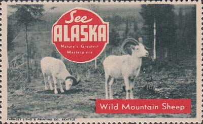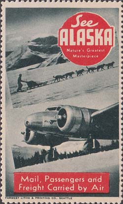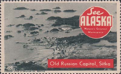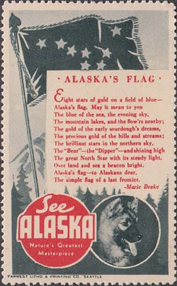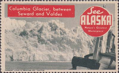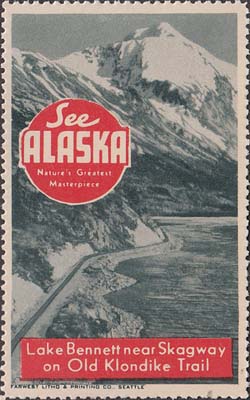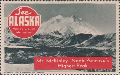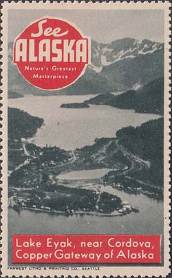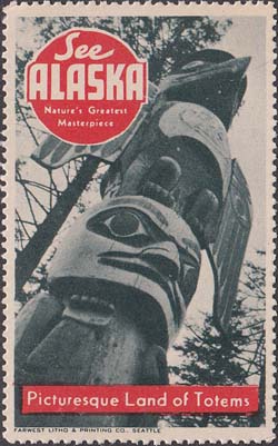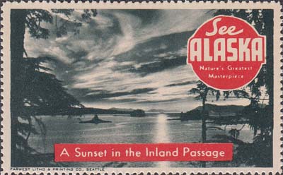 1948(?) г. Разм. рис. 38 х 63 или 63 х 38 мм. Трехцветная печать на белой бумаге. Зубц. 11 3/4. С клеем. В центр различные виды Аляски с подписями на английском языке. В круглой рамке текст в четыре строки на английском языке: "Виды величайших шедевров природы Аляски".