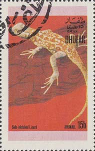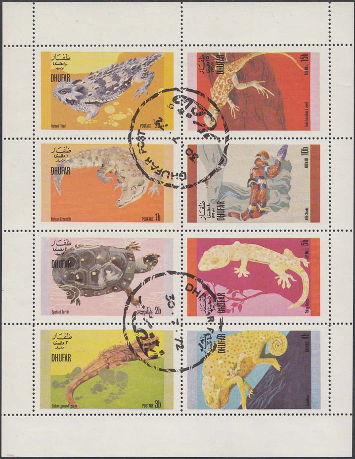 1972 г. Рептилии. Разм. рис. 45 х 26 мм. Многоцветная печать низкого качества на белой глянцевой бумаге. Зубц. 14.